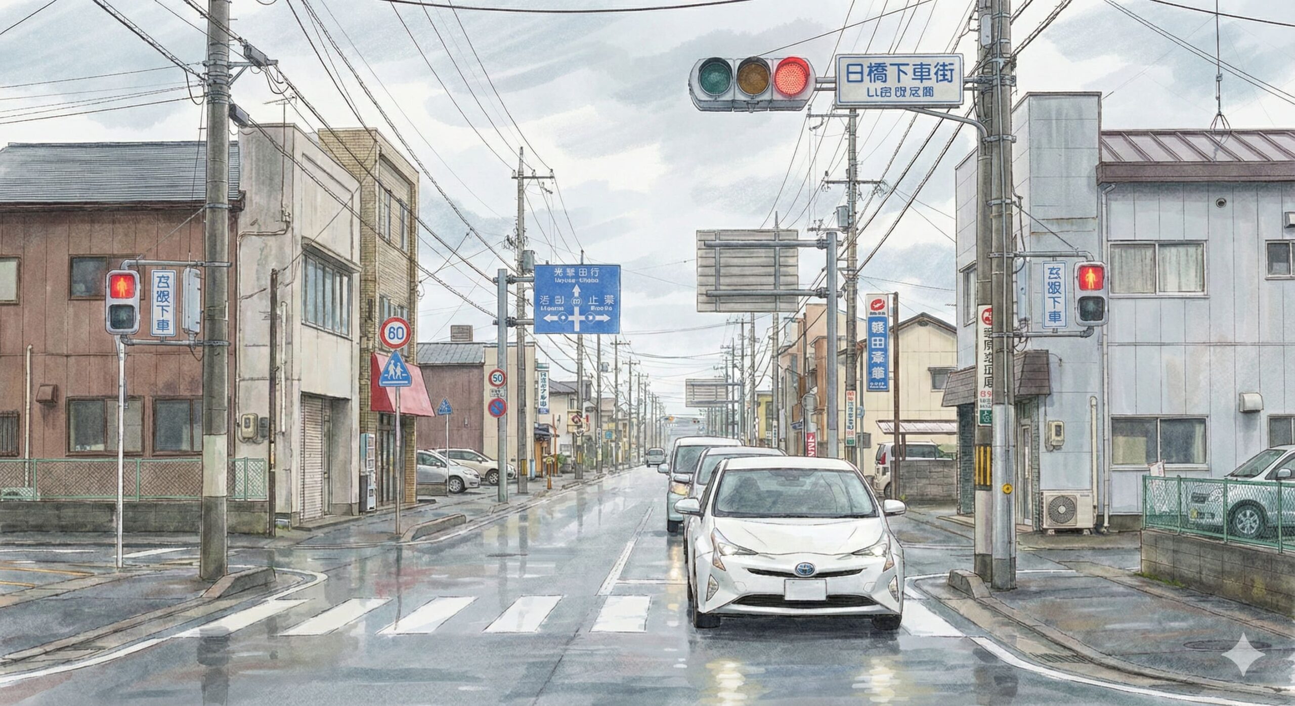 - 信号が赤に変わったので、交差点の手前で車を停める