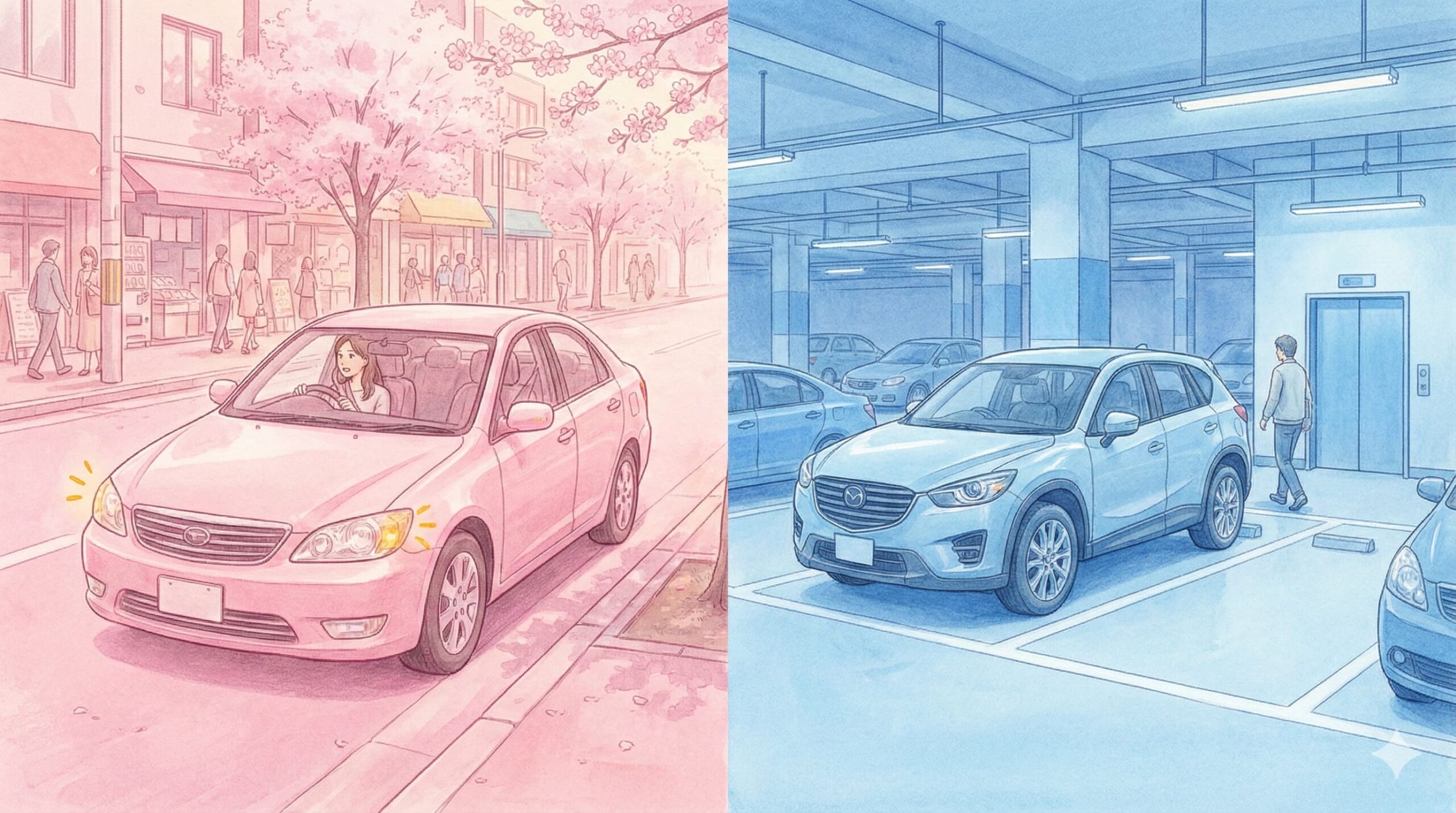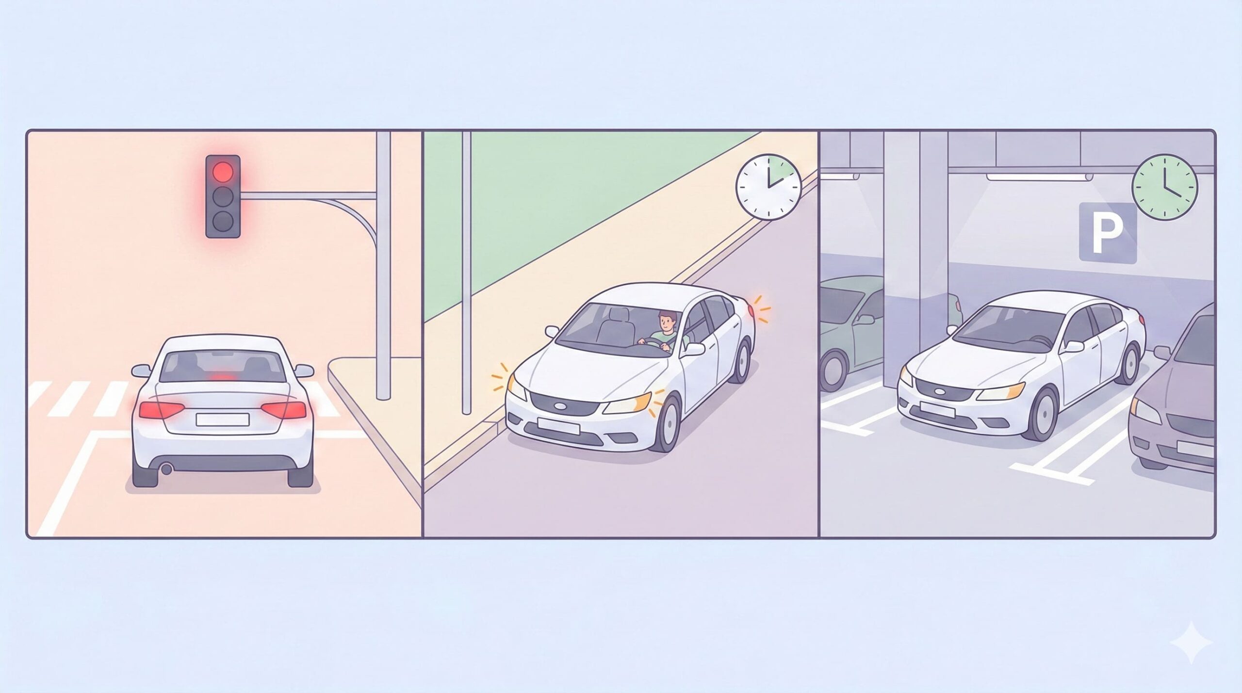 「車から離れている時間が長い」=駐めると覚えておくと、停めるとの違いが分かりやすくなります。