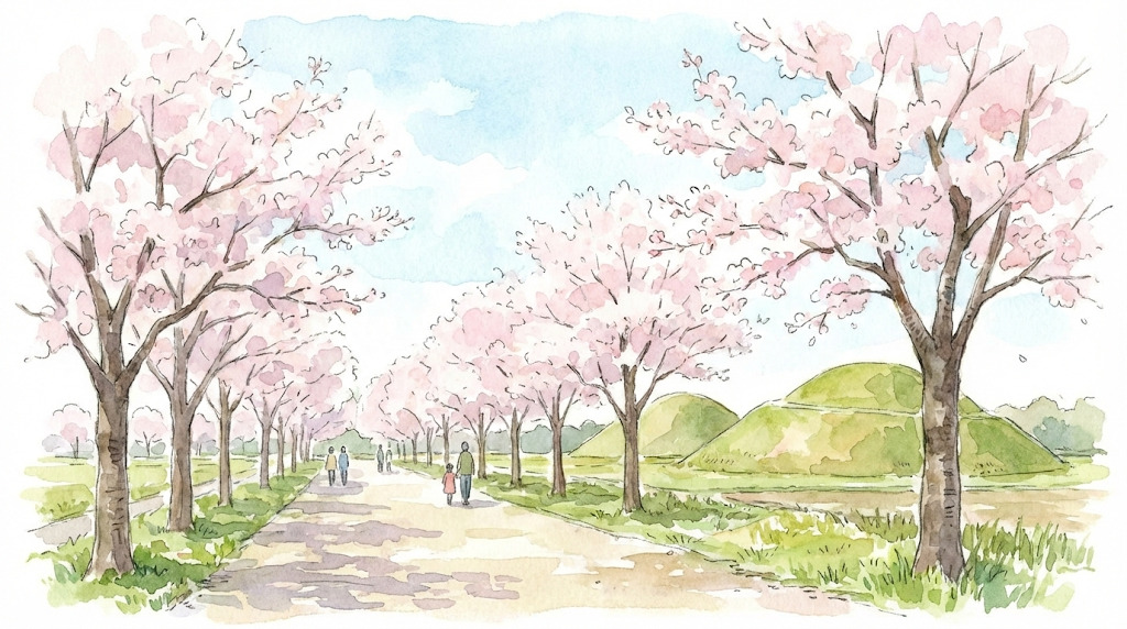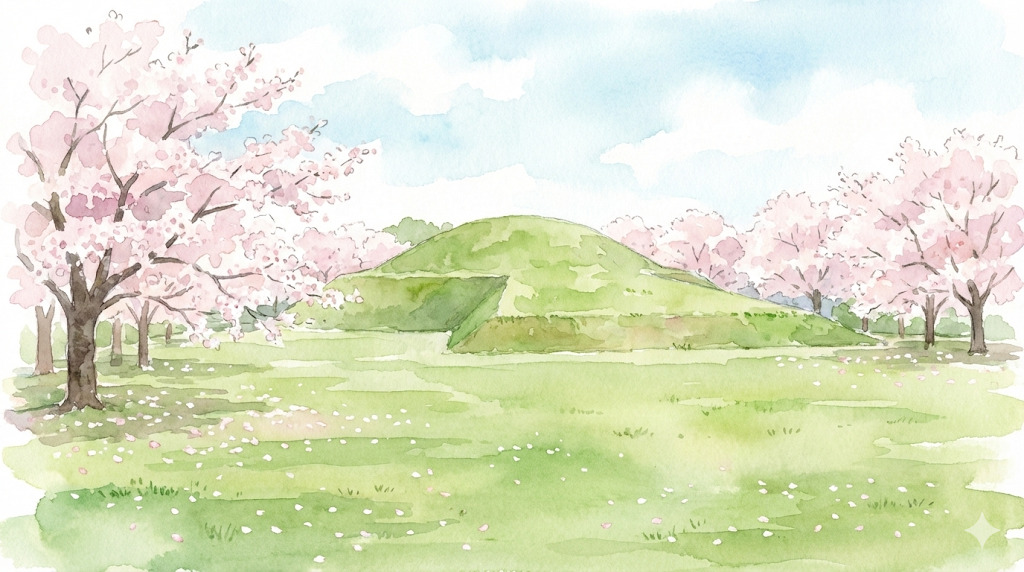 歴史ある古墳群と桜が調和する風景は、にぎやかな名所とはひと味違う魅力があります。