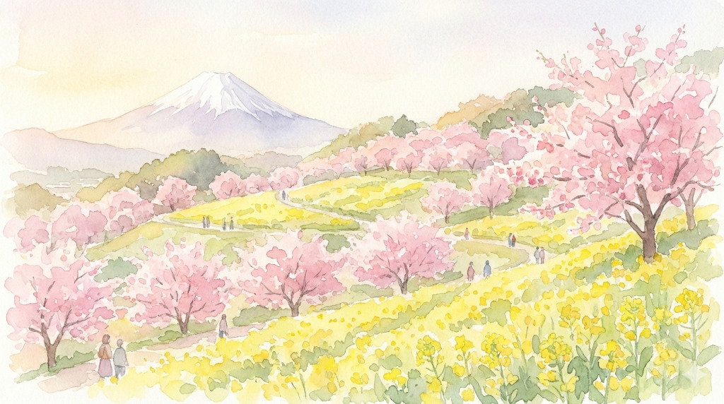 河津桜と菜の花が一足早く春を彩り、晴れた日には富士山との共演も楽しめます。
