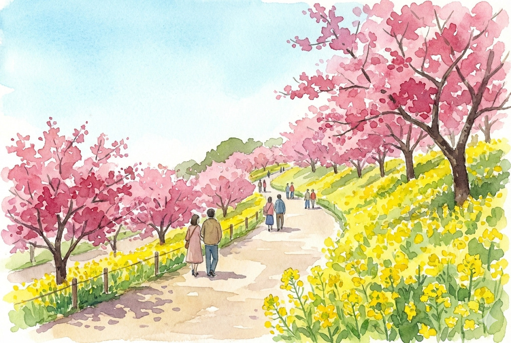 - 河津桜×菜の花の色鮮やかなコントラスト