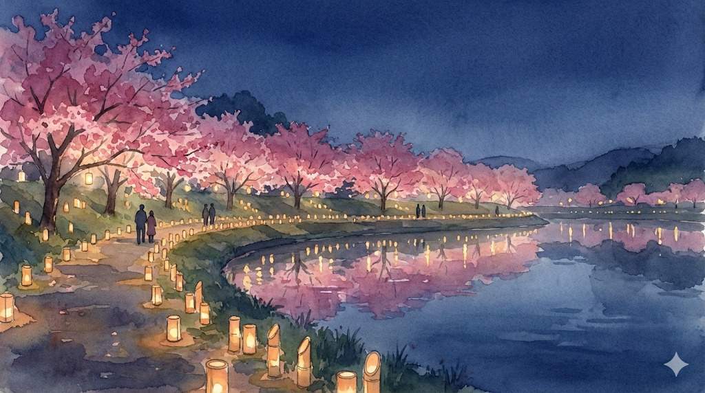 ② 佐久間ダム公園:竹あかり夜桜が幻想的