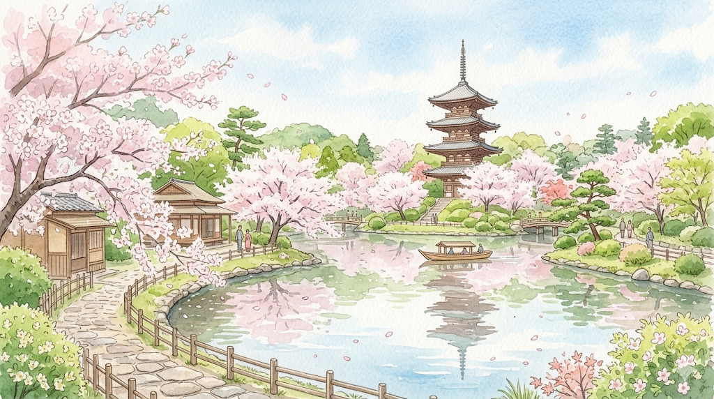 桜だけでなく、池、石橋、三重塔、和風建築と一緒に春の景色を楽しめるのが大きな魅力です。