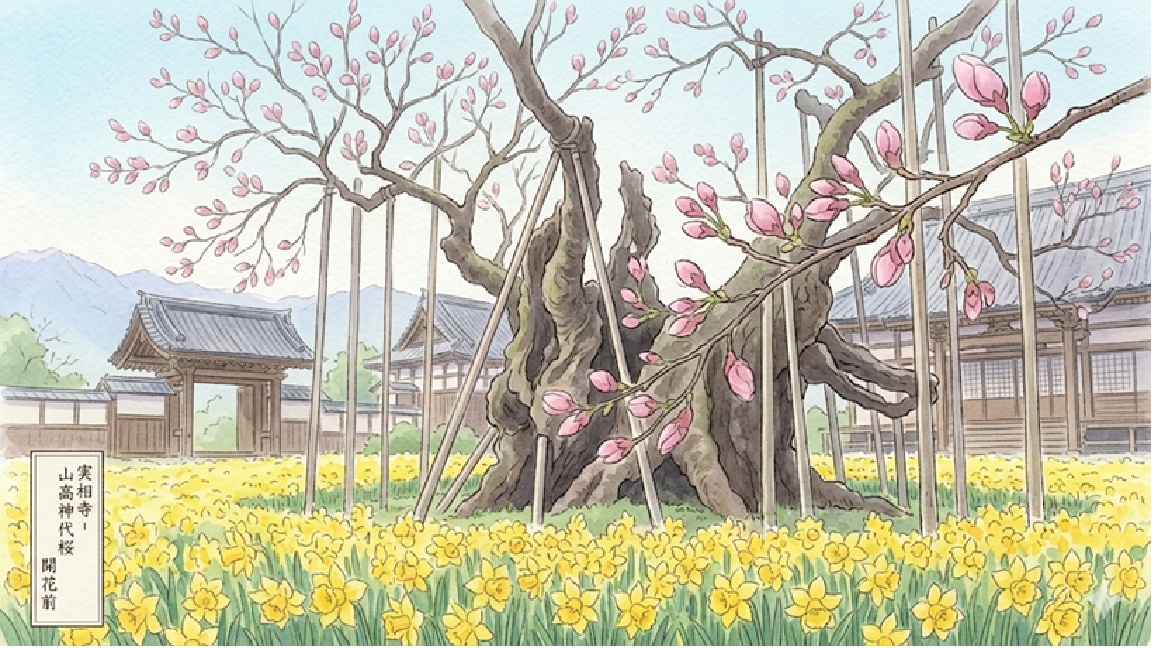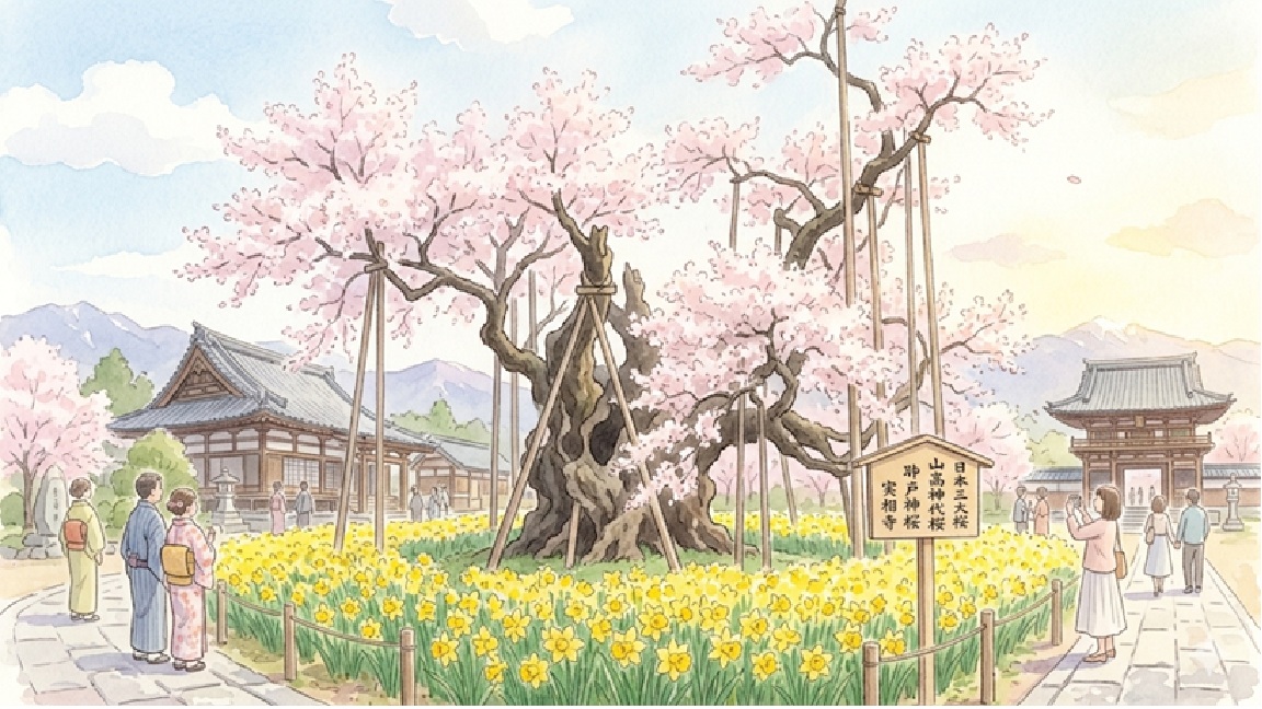 満開時には樹齢2000年の巨大な桜が境内いっぱいに広がり、足元には約8万株のラッパ水仙が咲き、桜の淡いピンクと黄色の花のコントラストが楽しめます。