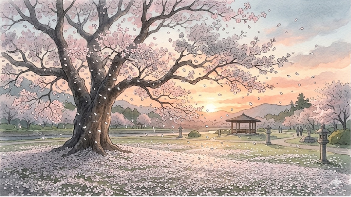 満開時には巨大な一本桜が公園を白く染め、散り際には淡い墨色の花びらが舞う幻想的な景色が楽しめます。