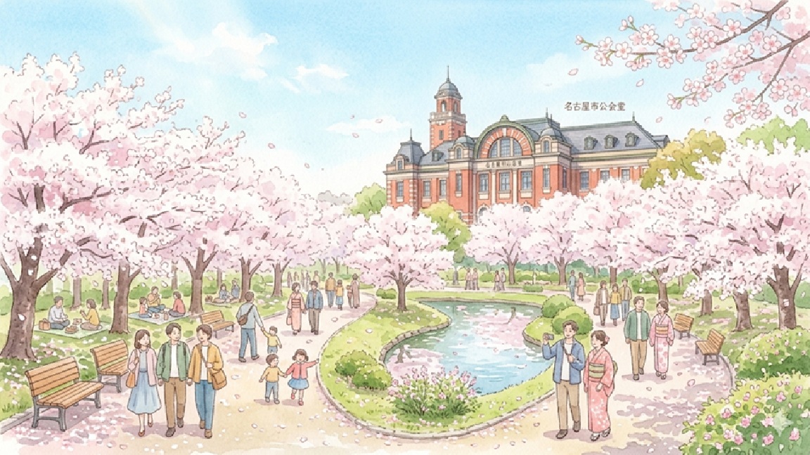 特に洋風建築の名古屋市公会堂と桜の組み合わせは、鶴舞公園ならではの景観として人気があります。