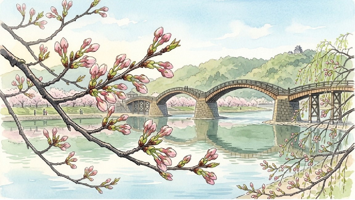 2026年現在、錦帯橋周辺の桜は「つぼみ」の状態です。