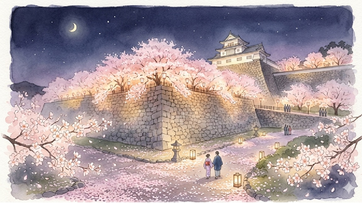 夜にはライトアップされた桜と石垣が幻想的な雰囲気を演出します。