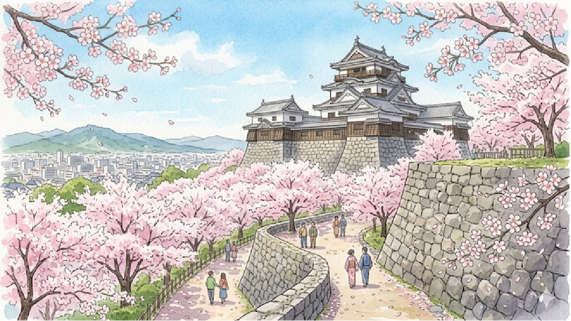満開時には天守閣周辺の桜が咲き誇り、松山城の石垣や城郭と桜の景色が美しい花見スポットになります。