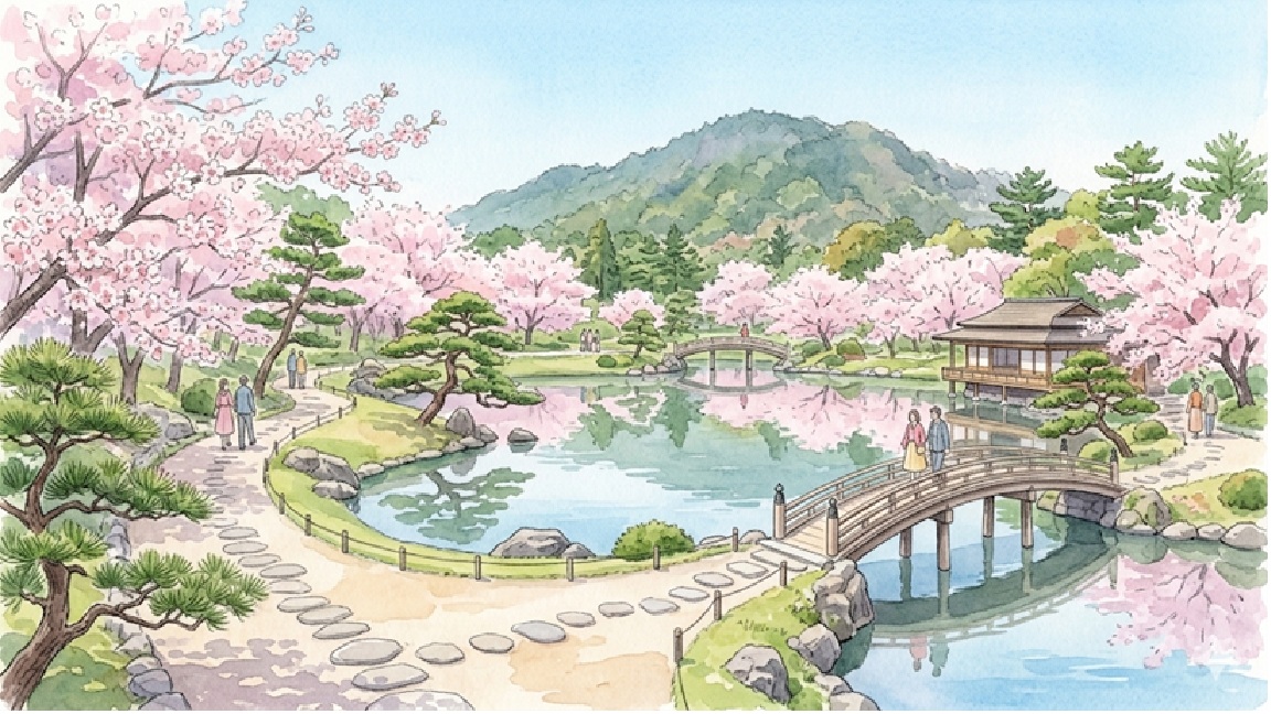 広大な庭園内には約300本の桜が植えられており、松の緑と桜の淡いピンクが調和する美しい景色を楽しめます。
