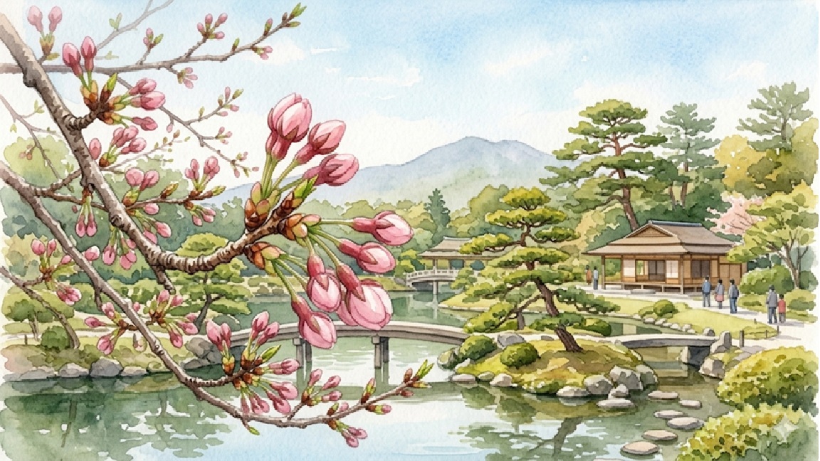栗林公園の桜は2026年3月14日時点ではつぼみで、開花は3月25日頃と予想されています。