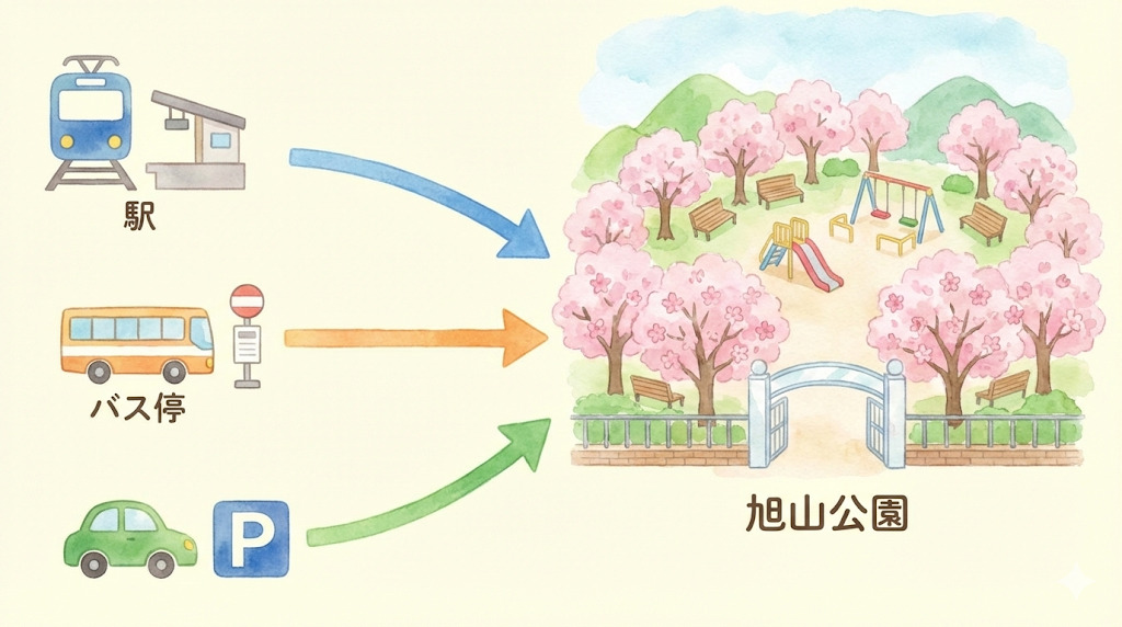 旭山公園夜桜まつりへは、公共交通機関の利用が便利です。