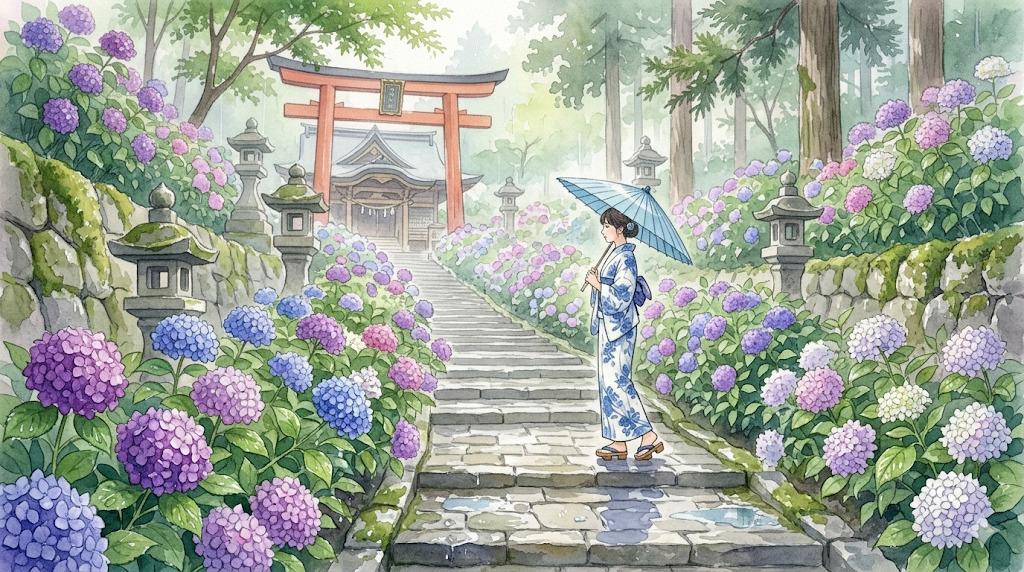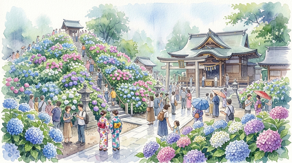 例年は6月中旬頃に見頃ピークを迎え、境内全体が色とりどりのあじさいで彩られます。