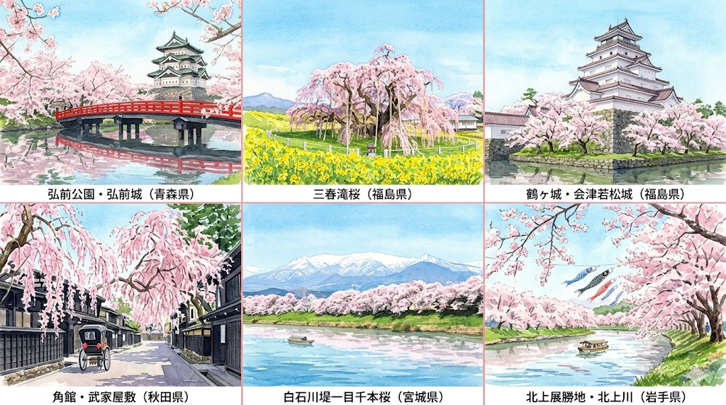 東北では地域によって桜の開花時期が異なり、長く花見を楽しめるのが特徴です。2026年4月現在は、満開〜桜吹雪のスポットと、これから見頃を迎えるスポットが混在しています。