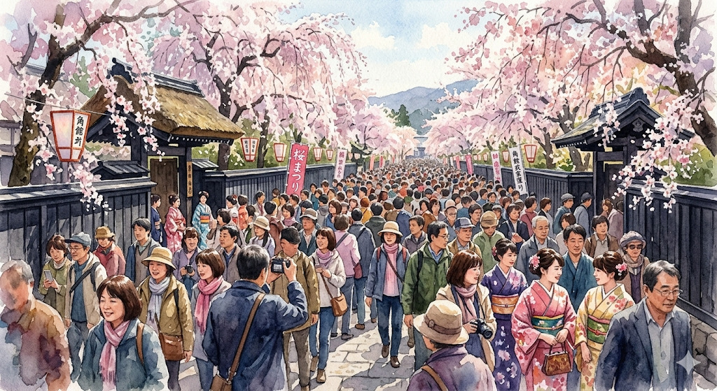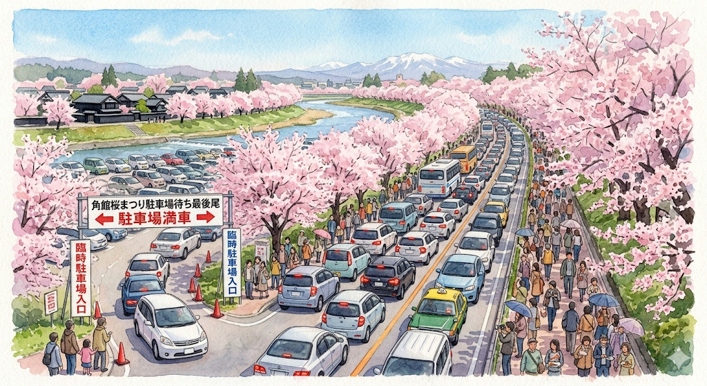 特に桜まつり期間の10:00〜15:00、土日祝は「非常に混雑」となり、武家屋敷通りは人で埋まるほどの状況です。