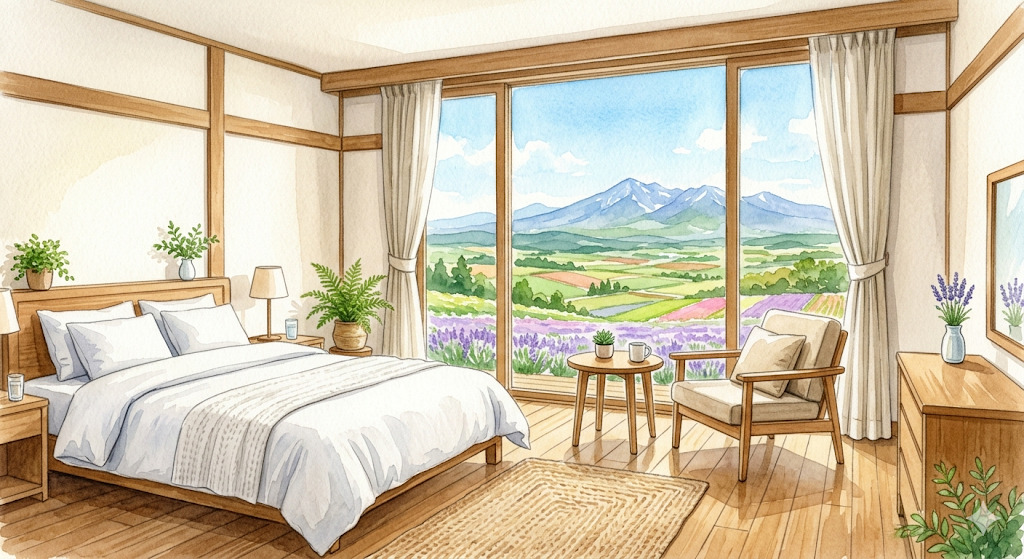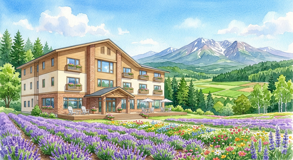 ファーム富田から車で約4分と非常に近く、ラベンダー観光の拠点に最適です。温泉もあり、観光後にゆっくり過ごせます。