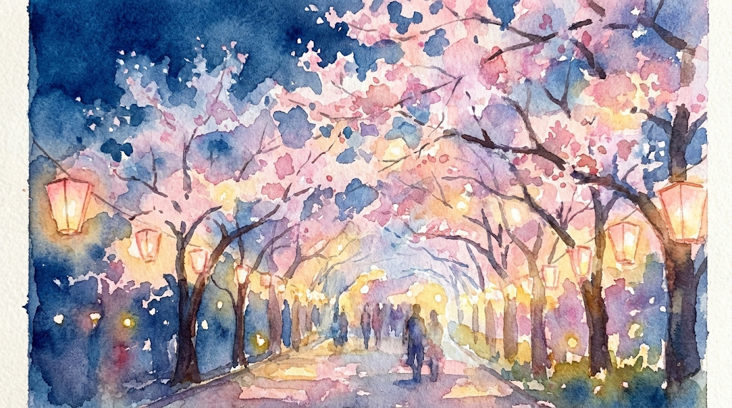 約3,000本の桜が一直線に咲き誇る圧巻の景色。歩きながら桜のトンネルを楽しめます。 - 夜のライトアップ(例年実施)