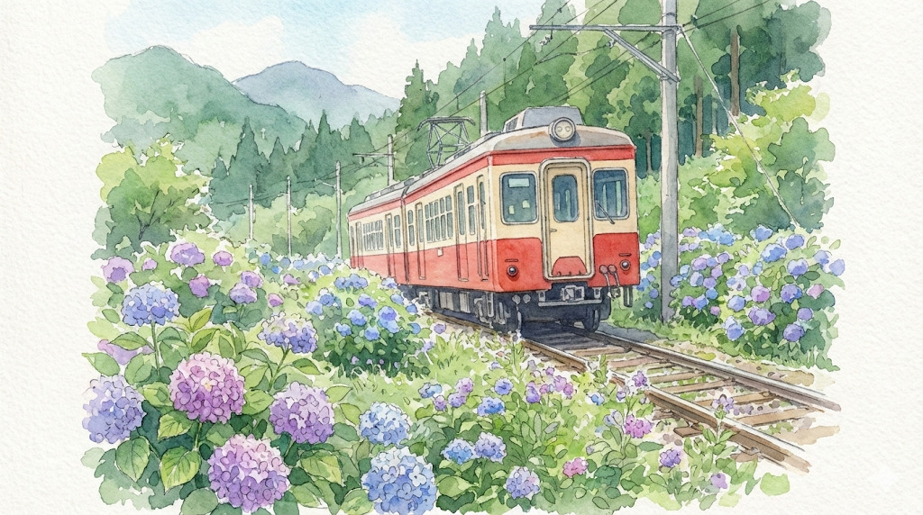 箱根の初夏の風物詩「箱根あじさい電車」。沿線に約1万株以上の紫陽花が咲き、車窓から花のトンネルを楽しめる人気観光列車です。