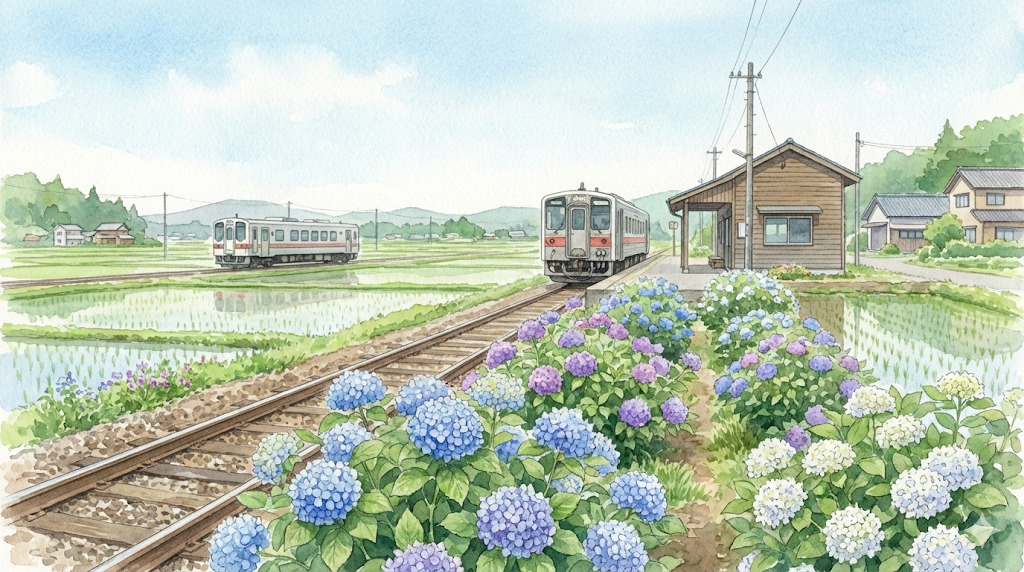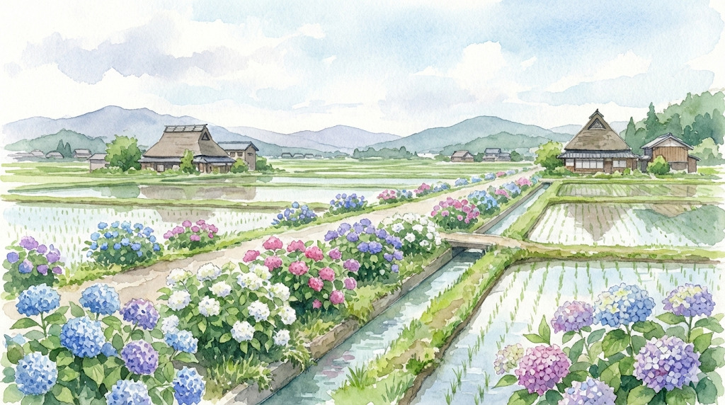 田植え直後の緑の水田と、青・紫・ピンクといった色とりどりのあじさいが織りなすコントラストは、訪れた人々を感動させます。