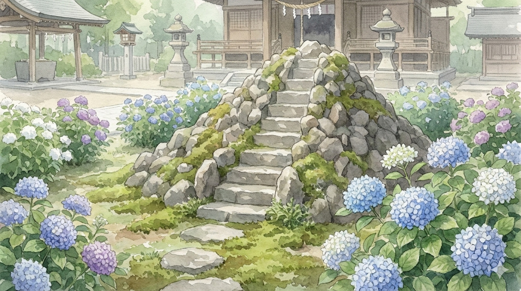 | 富士塚(白山富士) | お祭り期間中のみ登れる富士塚。斜面に咲くあじさいと高所からの眺望で立体的な写真が撮影可能。 |
