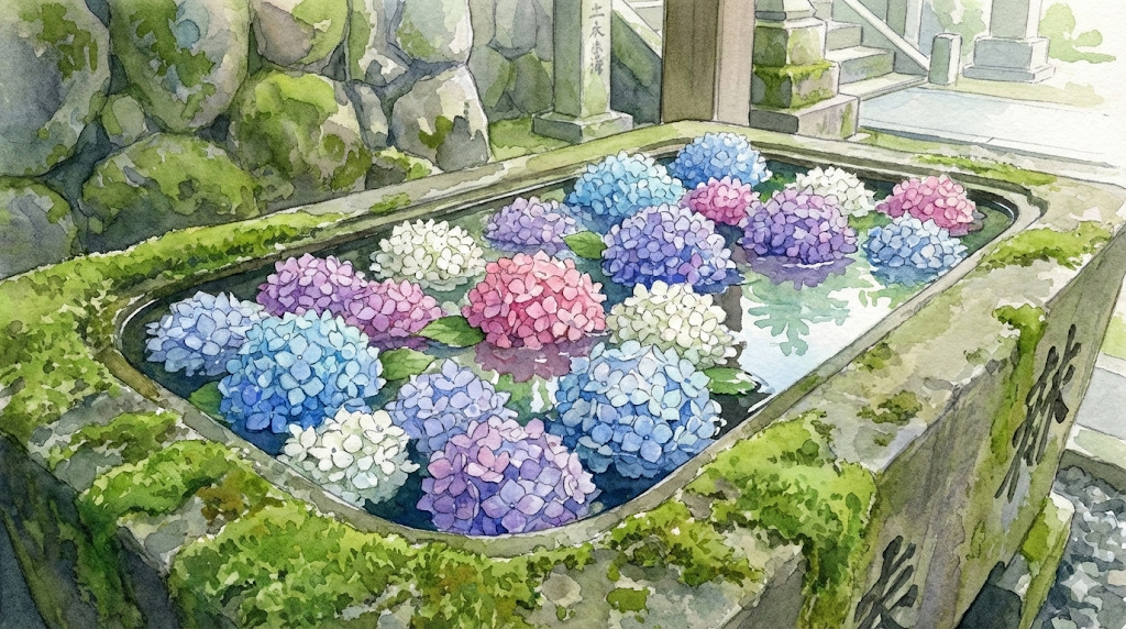 境内の手水舎には、カラフルなあじさいを浮かべた「花手水」が設置されます。