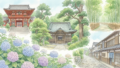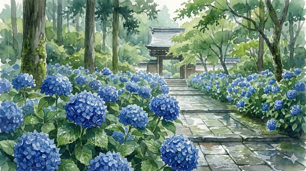 約2,500株のヒメアジサイが咲き、境内が青一色に染まります。5月下旬から咲き始め、6月中旬にピークを迎える年が多いです。