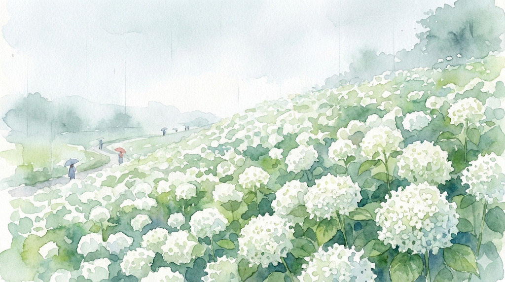 - 見どころはアナベルの丘と約100種の紫陽花散策